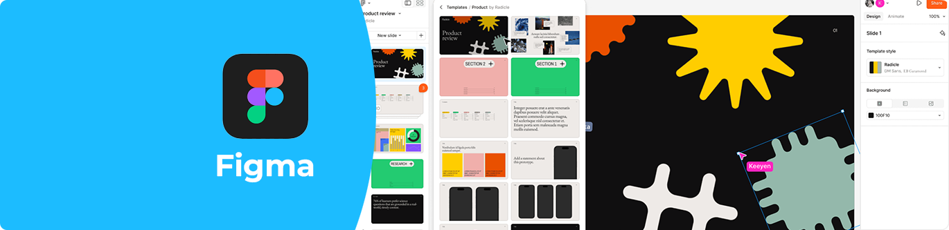 - 프레젠테이션: Figma의 Slide deck 기능을 활용하면 프레젠테이션 자료를 쉽고 빠르게 제작할 수 있습니다. 아직 베타 서비스 중이기는 하지만, 다양한 프레젠테이션 템플릿도 제공하고 있어 디자인에 자신이 없더라도 깔끔하고 심미성까지 갖춘 자료를 간단히 만들 수 있습니다.